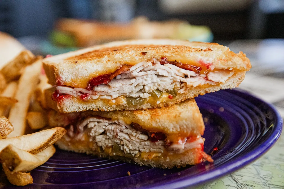 Turkey, bacon, jalapeños, cheddar cheese, and homemade raspberry jam on grilled sourdough – 15.99